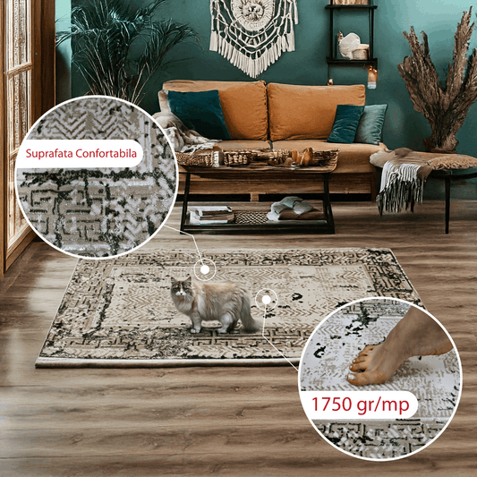 Covor Viridi Harmonia, Living/Dormitor, Verde, crem, auriu, Incalzire in pardoseala, Fir Scurt 8 mm , Dimensiuni 100x200 cm, 1750 g/m², BravaCasa