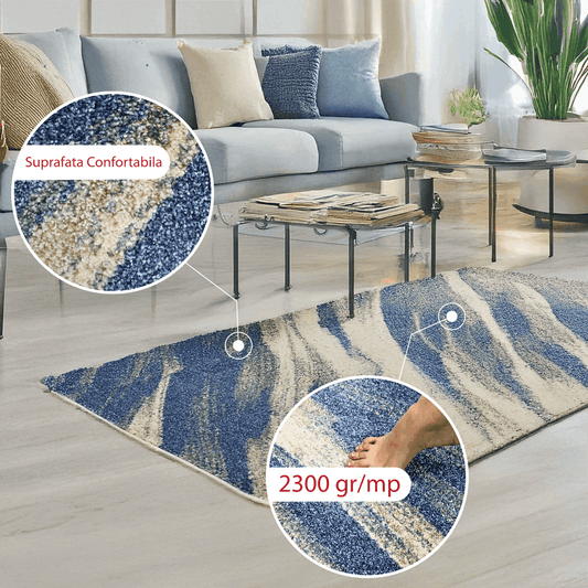 Covor Punctira Cremoza, Living/Dormitor, Albastru, Crem, Maro, Incalzire in pardoseala, Fir Scurt 12 mm, Dimensiuni 100x200 cm, 2300 g/m², BravaCasa