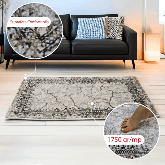 Covor Olympus Grid, Living/Dormitor, Gri si Crem, Incalzire in pardoseala, Fir Scurt 8 mm, Dimensiuni 100x200 cm, 1750 g/m², BravaCasa