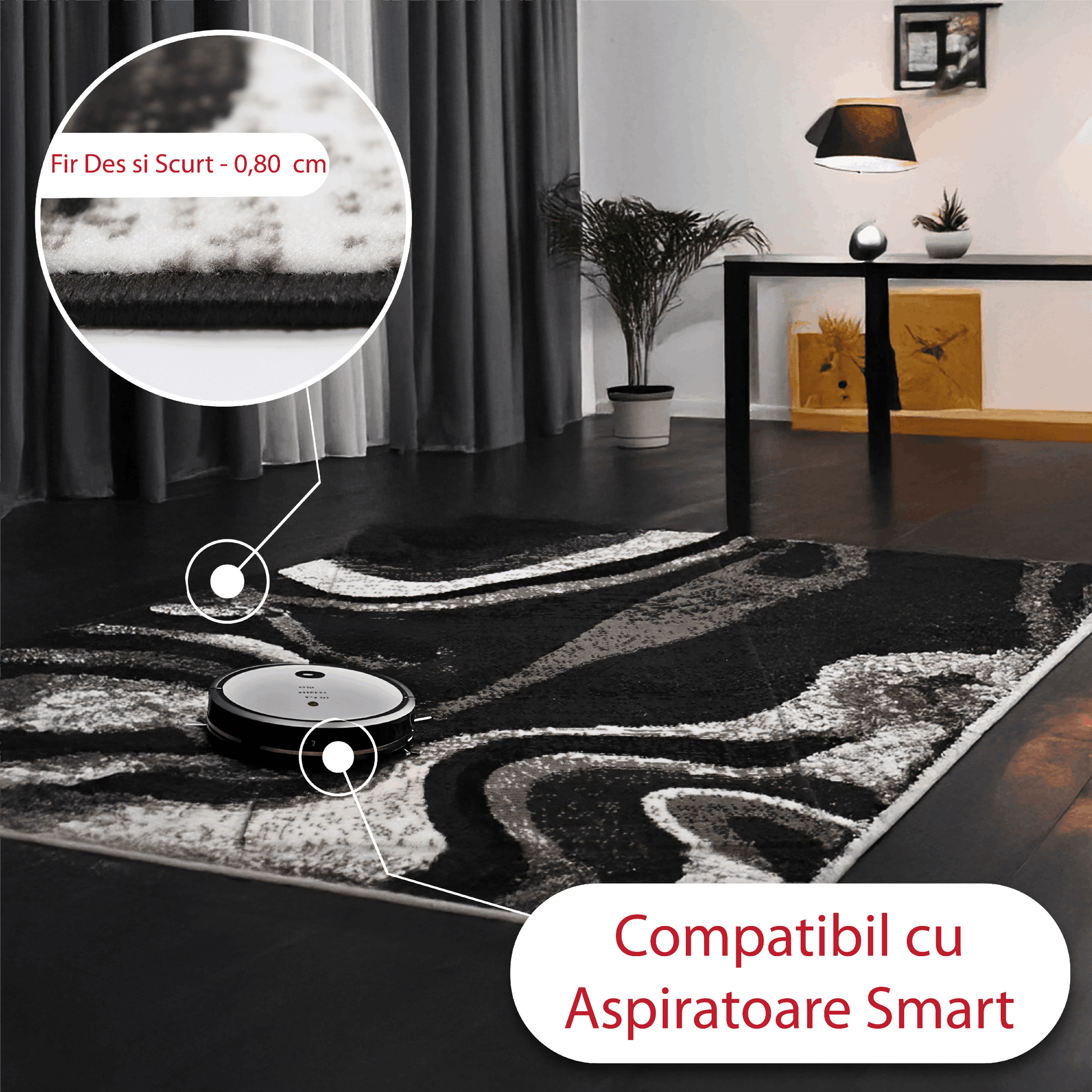 Covor Obsidian Tide, Negru/Alb/Gri, Incalzire in pardoseala, Fir Scurt si Des de 8 mm, 80x150 cm, 1300 g/m², BravaCasa